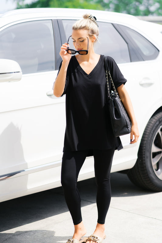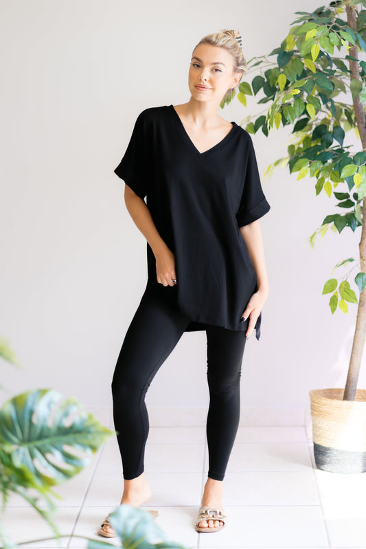 Brushed Dty Microfiber Short Sleeve Top and Pants Loungewear Set in Black