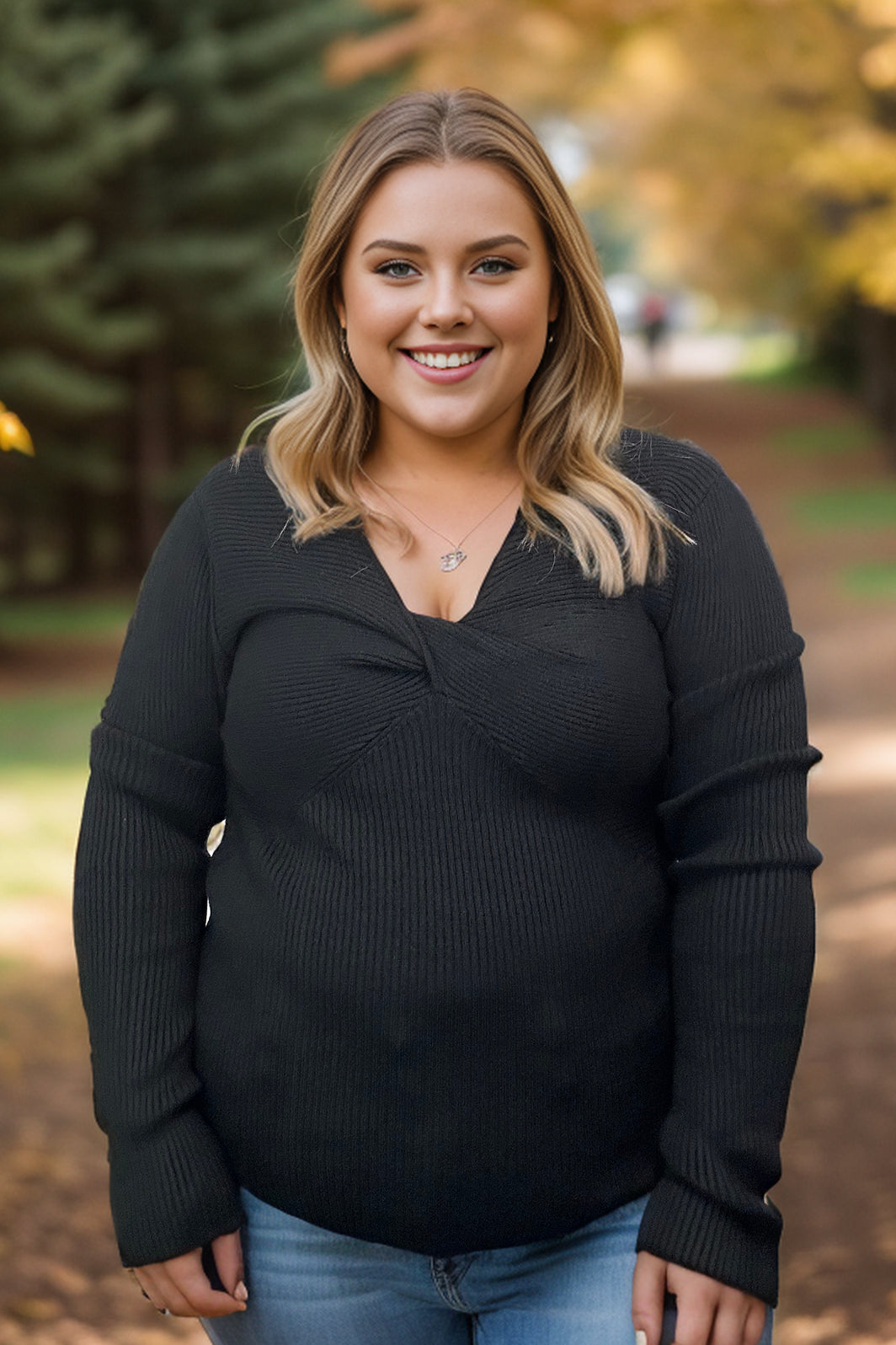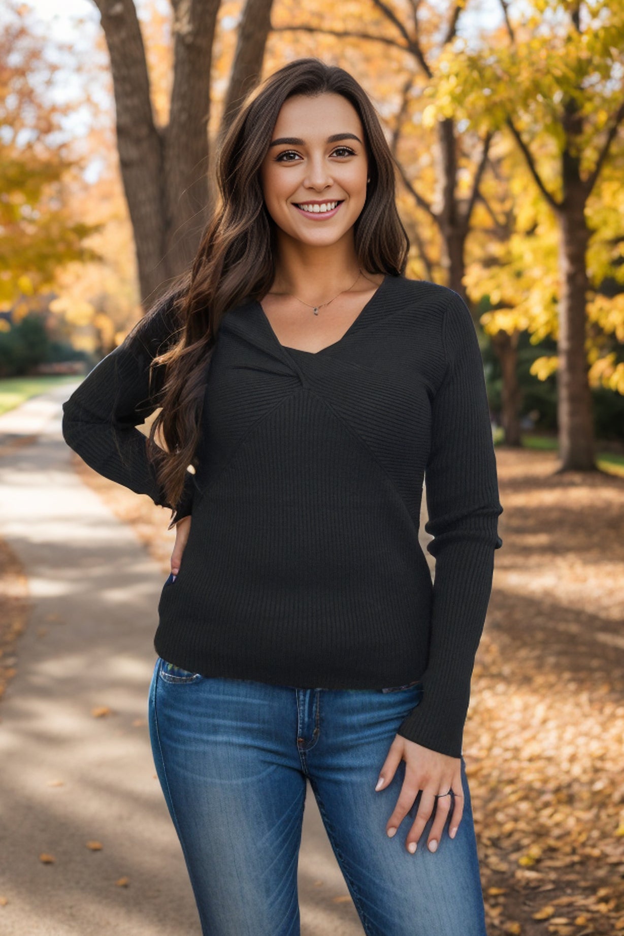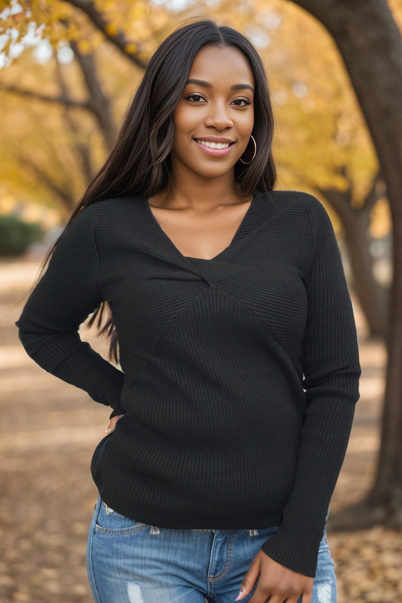 Unwind and look fabulous in the Don't Get Too Twisted - Darkest Black. This solid knit top features a flattering v-neck, gathered front detail, and long sleeves. With a fitted silhouette that hugs your curves in all the right places, you'll feel confident and comfortable while turning heads.
