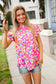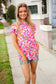 This woven knit multicolor animal print patchwork blouse is a stunner! Brighten any room or event that you wear it to with its ruffled capped short sleeves, frill mock neck and fun print.