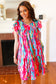 Look more than lovely in this multicolor abstract print knee-length woven dress with a beautiful drape, tiered design and side pockets. Get your summer on with short flutter sleeves! Perfect for upcoming holiday.