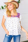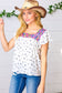 This linen-like top features a stunning geometric embroidered square neck and flutter sleeves. A navy floral print and keyhole back complete this spring-ready style!