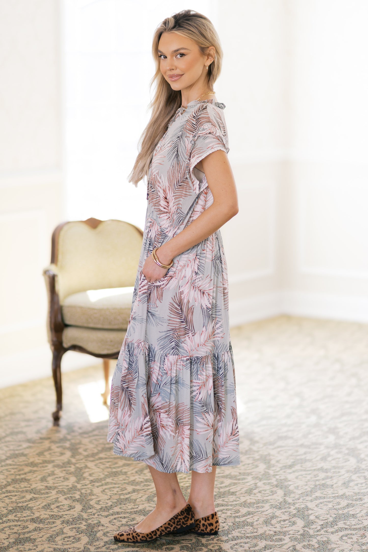 Feel like you're in paradise with our Palms & Paradise Dress! This tropical printed tiered midi dress will transport you to a world of palm trees and ocean breeze. Stay cool, comfortable, and stylish all day long. Aloha, summer vibes!